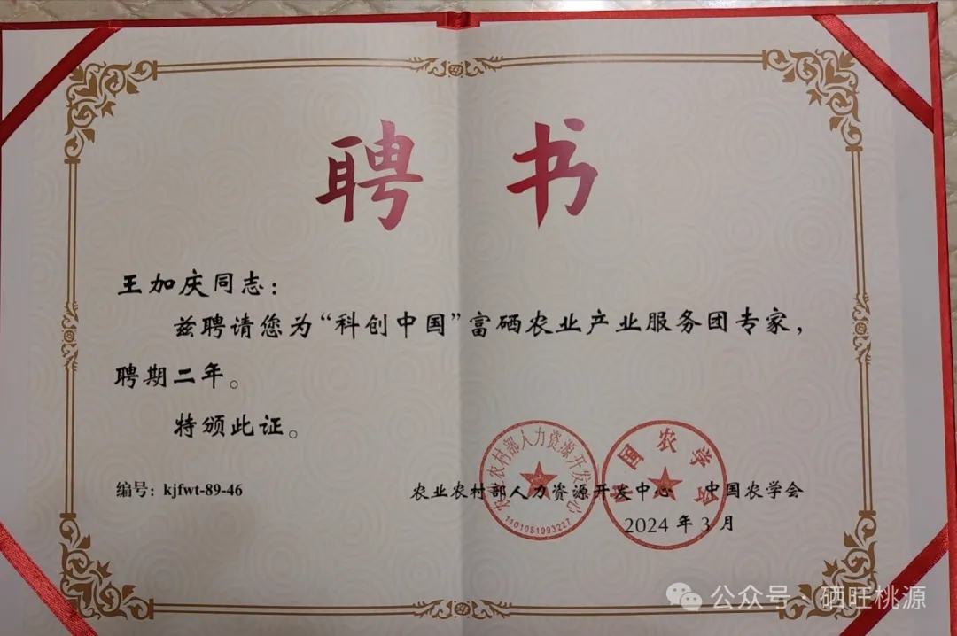 會上還對“科創(chuàng)中國”富硒農(nóng)業(yè)產(chǎn)業(yè)專家服務(wù)團”進行了授牌,由農(nóng)業(yè)農(nóng)村部人力資源開發(fā)中心、中國農(nóng)學(xué)會在全國業(yè)界聘請了100名“科創(chuàng)中國”富硒農(nóng)業(yè)產(chǎn)業(yè)服務(wù)團”專家并頒發(fā)了聘書,我縣富硒功能農(nóng)業(yè)領(lǐng)導(dǎo)小組副組長王加慶被聘請為服務(wù)團專家之一,并頒發(fā)了聘書。